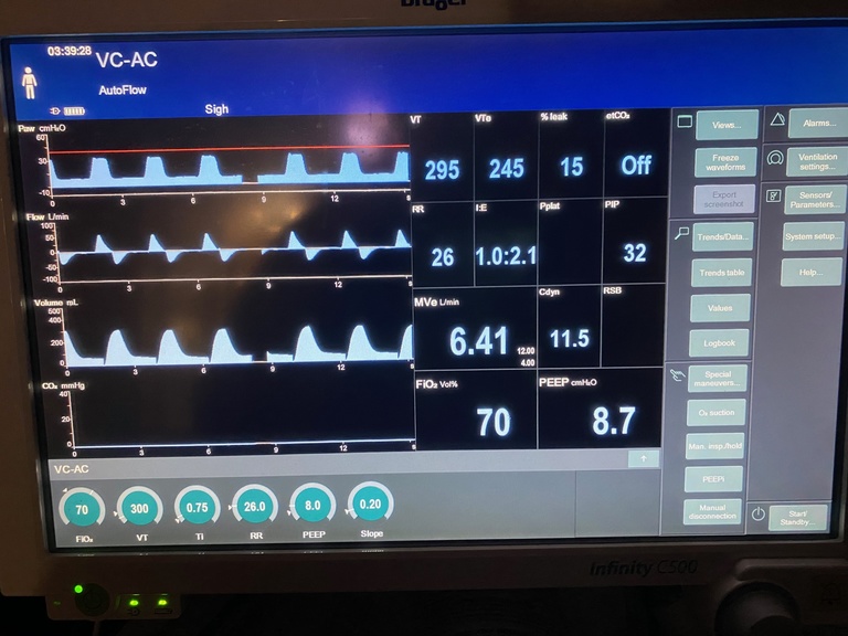 The peak pressure, seen on the top right hand corner of the screen, represents the total pressure in the circuit: that is, the sum of the plateau pressure and the airway pressure (Peak Pressure = Plateau Pressure + Airway Pressure). A normal peak pressure is less than 40 cm H2O. Causes of elevated pressure can be either an elevation in the plateau pressure or an elevation in resistance. To determine where the issue is an inspiratory hold can be used: if the plateau pressure is normal (that is, less than 25-30 cmH20) then consider issues that would cause increased airway resistance, such as bronchospasm, mucous plugging and a kinked endotracheal tube.